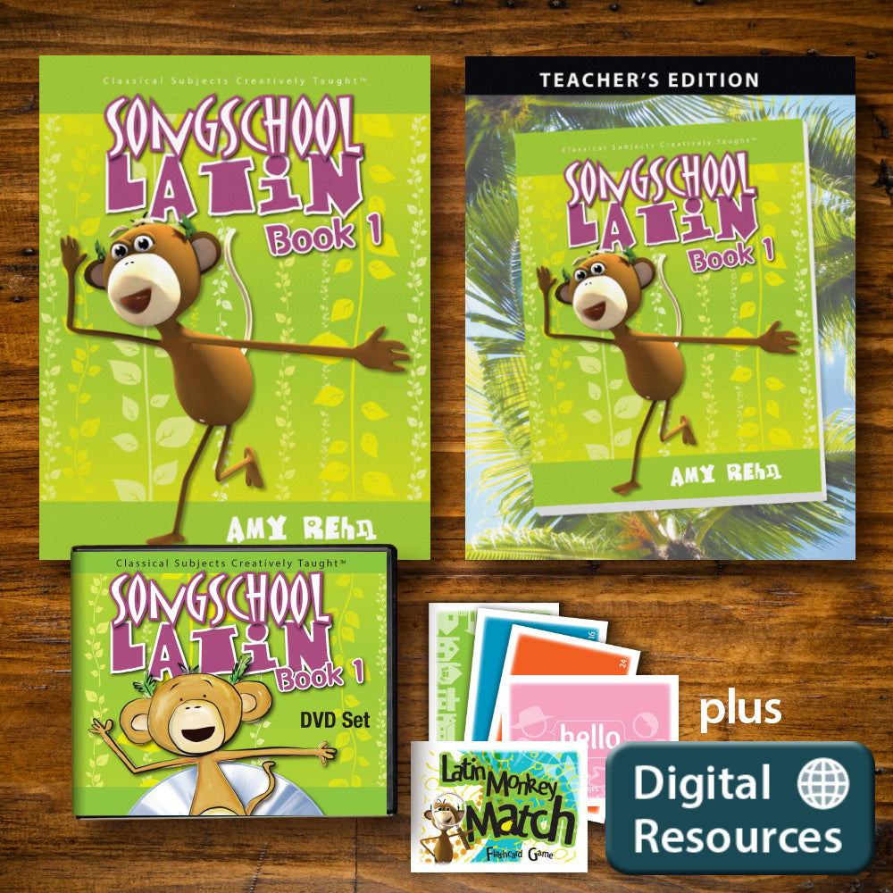 - Song School Latin Book 1 Streaming Video (or 3-DVD Set) A total of 24 episodes feature a lively magistra (teacher) who narrates the vocabulary practice, simple grammar lessons, and derivative training. Simeon the Monkey features vocabulary words in his animated story. There is also an animated "Derivative River" that highlights the way in which Latin words have come into various languages. The streaming option provides the convenience of instant access, as well as desktop, smart TV, and mobile viewing capabilities. For Homeschoolers, streaming access lasts for the life of the product. Returning school customers continue receiving streaming access at no annual cost when student editions are purchased by October 31st.